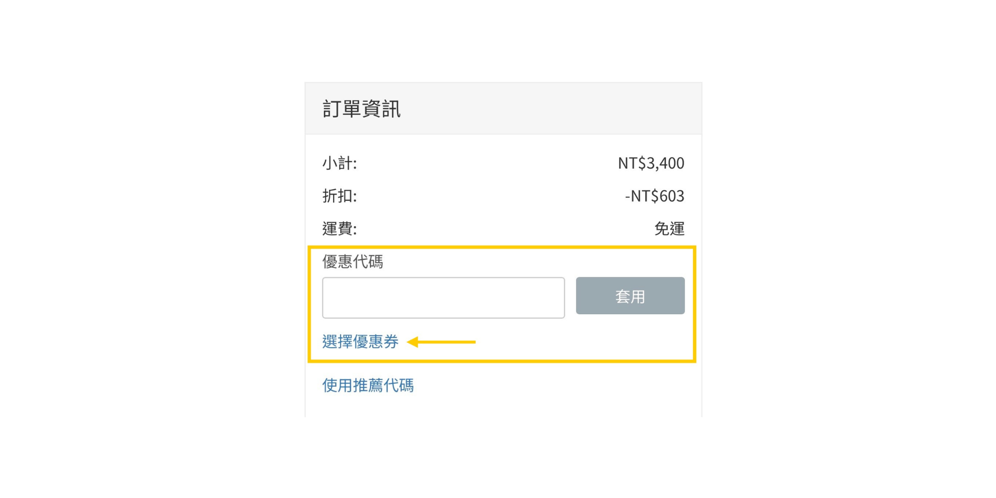 ✅ 使用方式:在結帳頁面的訂單資訊欄位點擊『使用優惠代碼』,再次點擊『選擇優惠券』,系統就會自動扣除111元折扣金🤍(下圖提供範例示範)