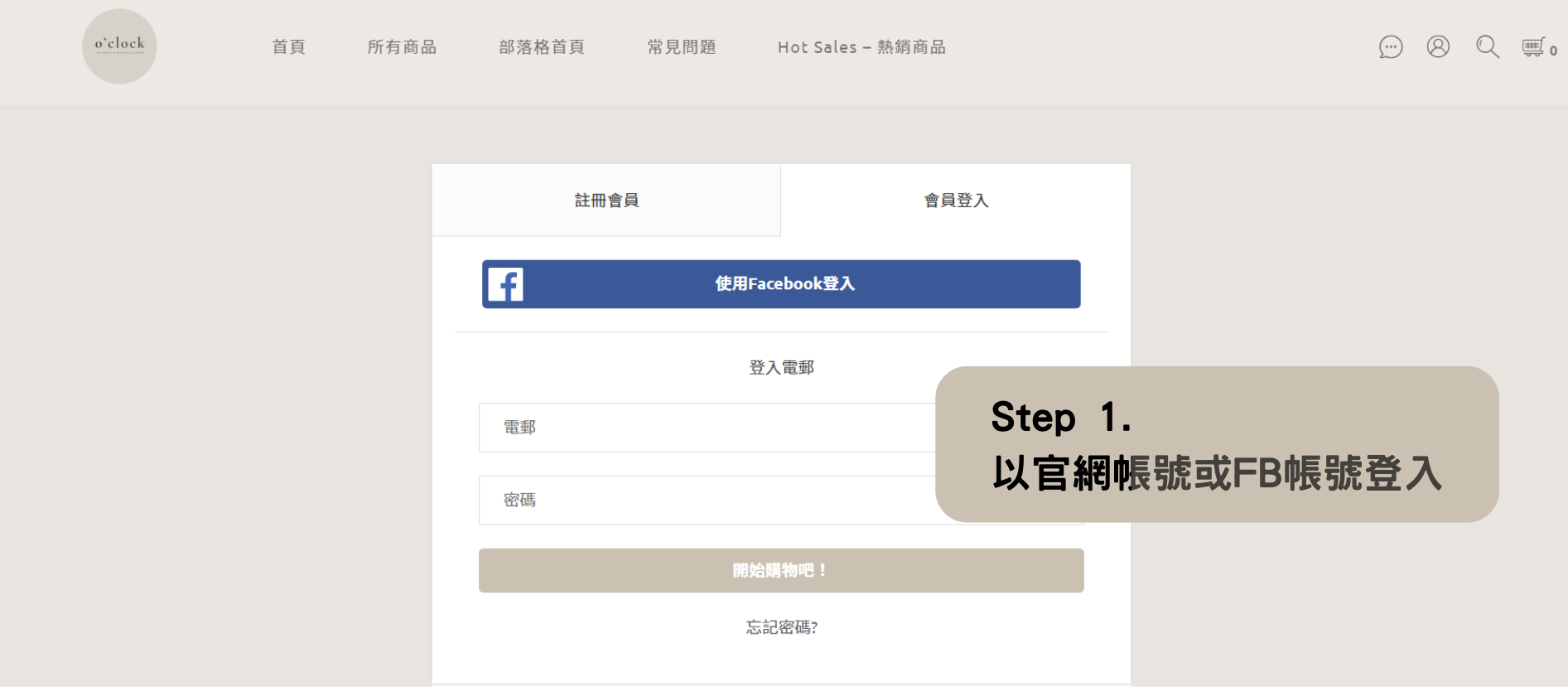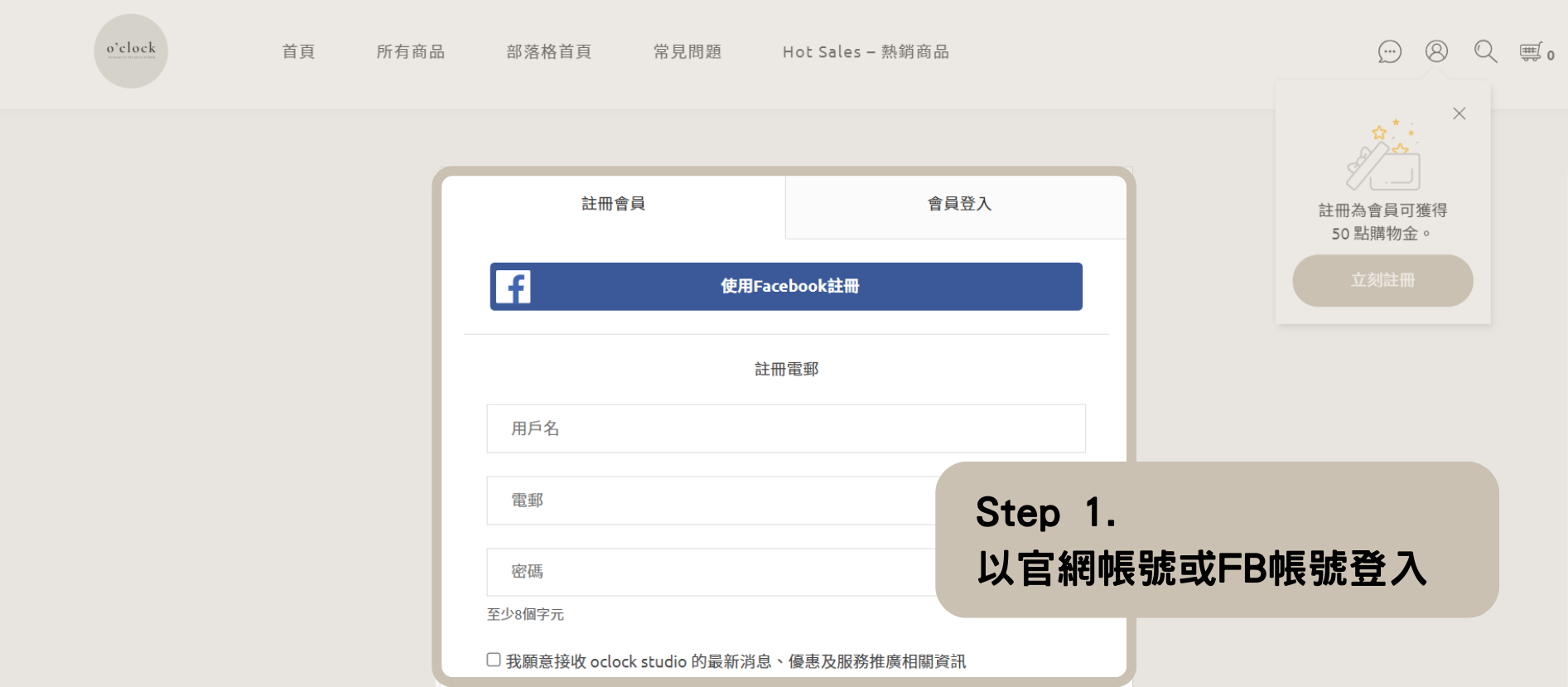 前往 o'clock studio 官網,找到右上方的【小人頭】圖示,點擊圖樣進入第一步。